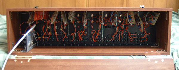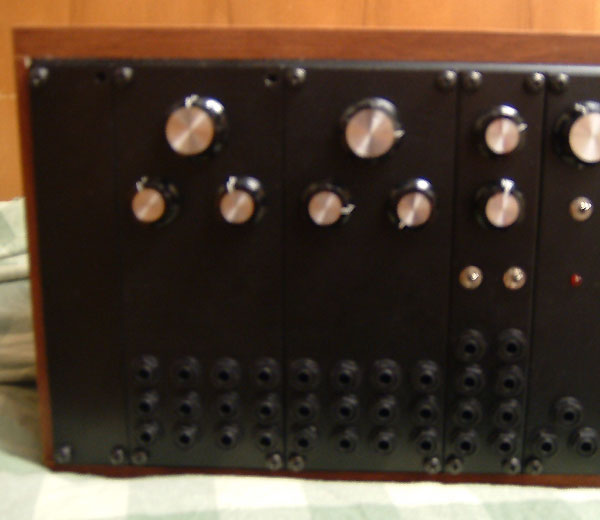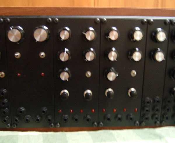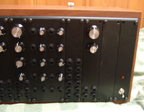 My modular runs off of +/- 15v DC. The panels are mounted on Rack Rails and are each 5U high. It uses 1/4" jacks. There are currently 12 modules, as follows (from left to right):